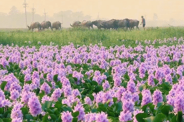 Khung cảnh cánh đồng hoa lục bình ở ngoại ô Hà Nội nở rộ, tỏa sắc tím nổi bật thu hút đông đảo du khách, nhiếp ảnh gia tới chụp hình, tham quan.